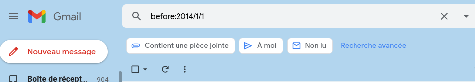 taper before: 2014/1/1 ou une autre année, vous allez afficher tous les messages envoyés ou reçus antérieurs à cette date.